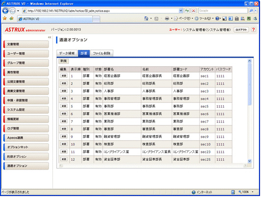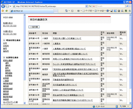 部門管理や報告期限のある通達の受領確認者などの管理を行います。 公開済みの通達を一括で非公開にする処理の管理も行います。